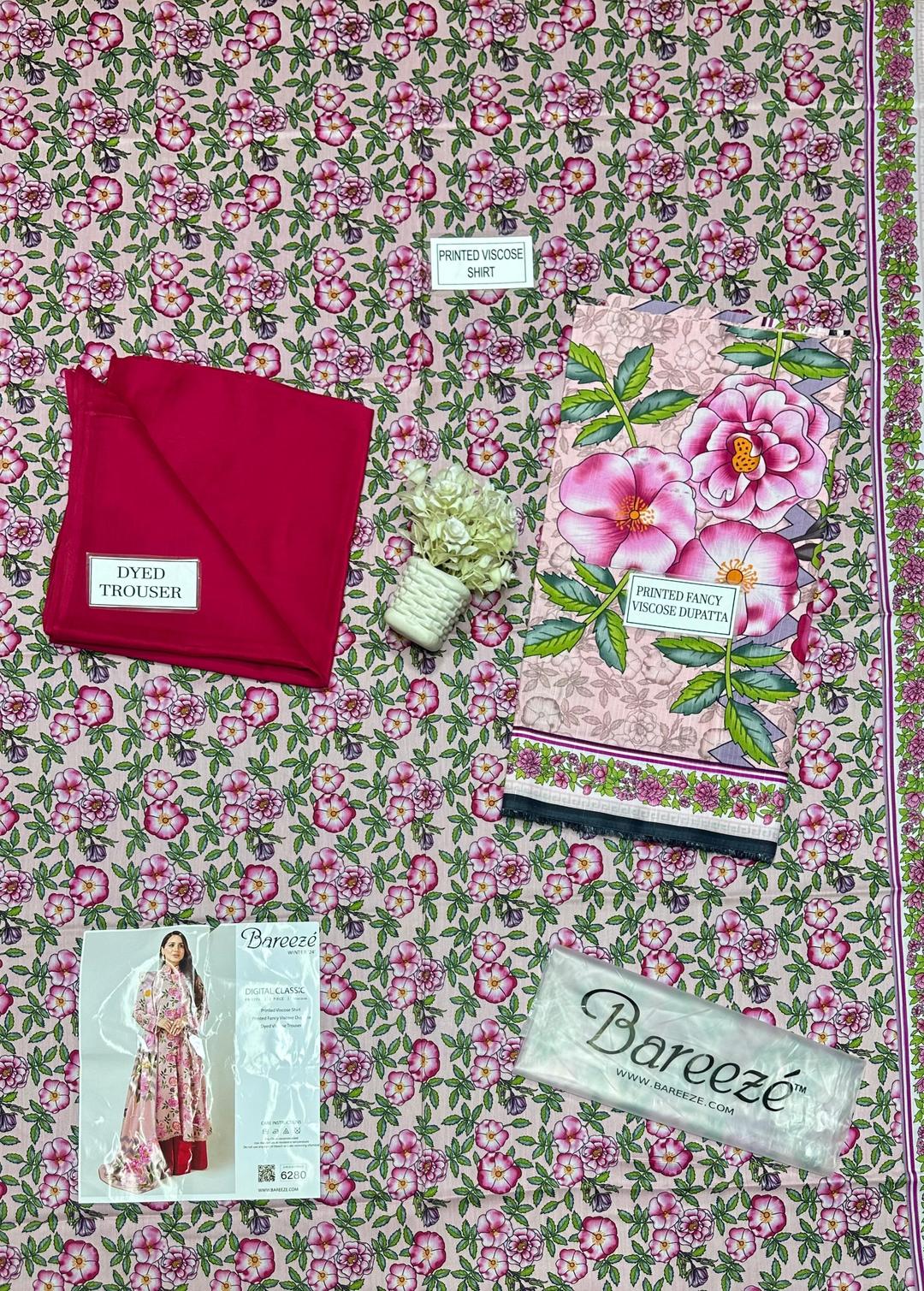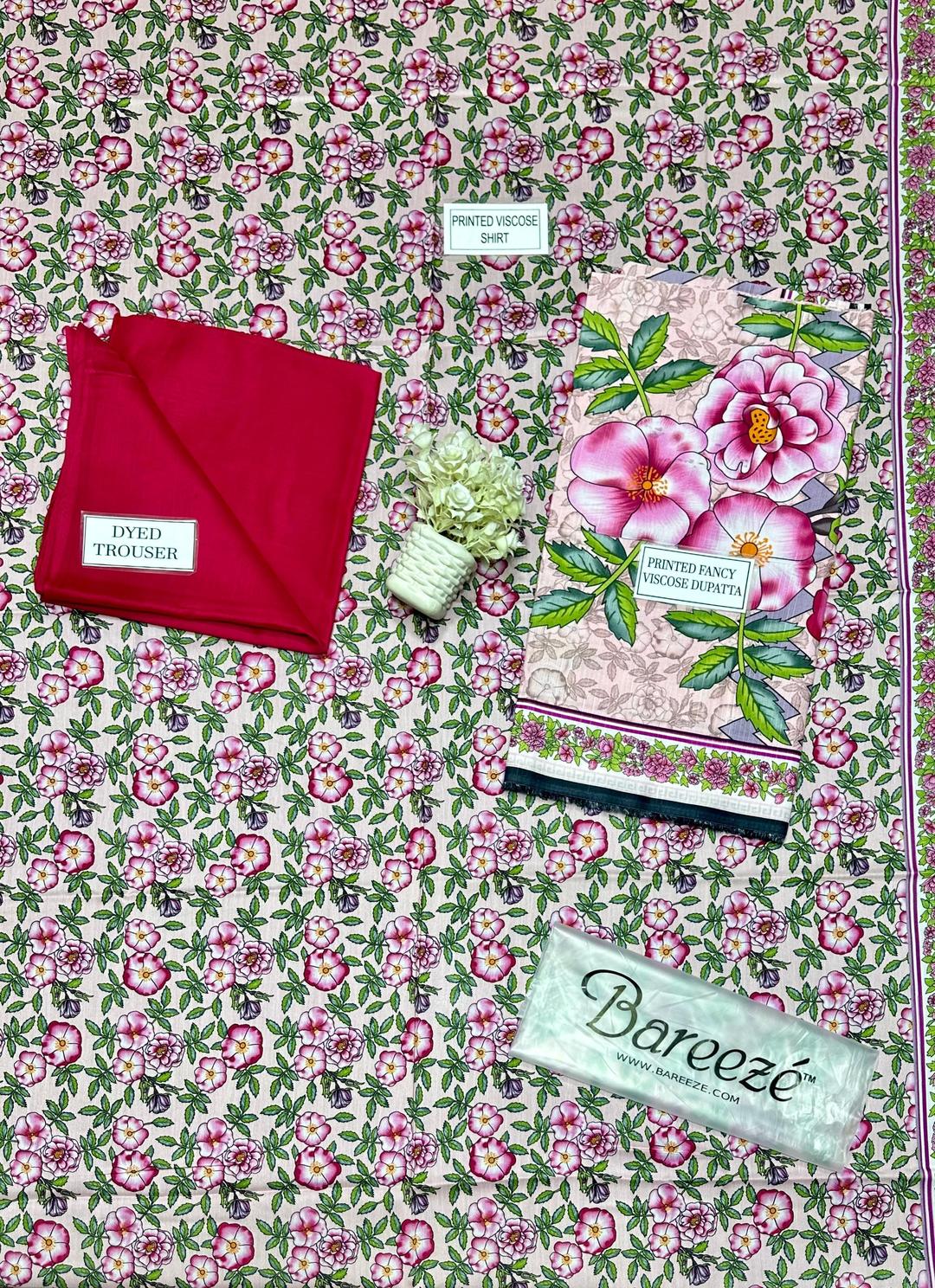 • Number Of Pieces: 3 Pcs• Package Includes: 1 x Shirt, 1 x Trouser, 1 x Dupatta• Shirt Cutting: 3.0 Meter• Trouser Cutting: 2.5 Meter• Dupatta Cutting: 2.5 Meter• Color: Pink